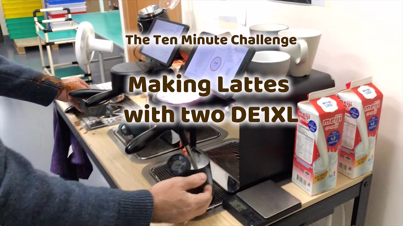 That works to a bit more than 8 lattes made in ten minutes (8.33, to be exact). That's 48 lattes/hour, per barista. With two baristas at two stations, each with 2 DE1XXL models, would get us to 96 lattes per hour.
