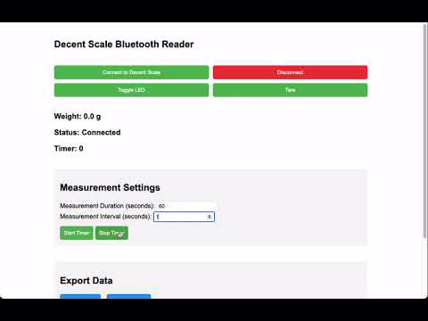 Here's a short demonstration of our first Chrome web app for the Decent Scale. You can get weight readings, save them and export them to a CSV spreadsheet or JSON document. Only works on Chrome browser, on Desktop OSes. Available for free, automatically, to anyone who has bought our Bluetooth scales. To use it, go to https://decentespresso.com/support/ and click on the Decent Scale button.
