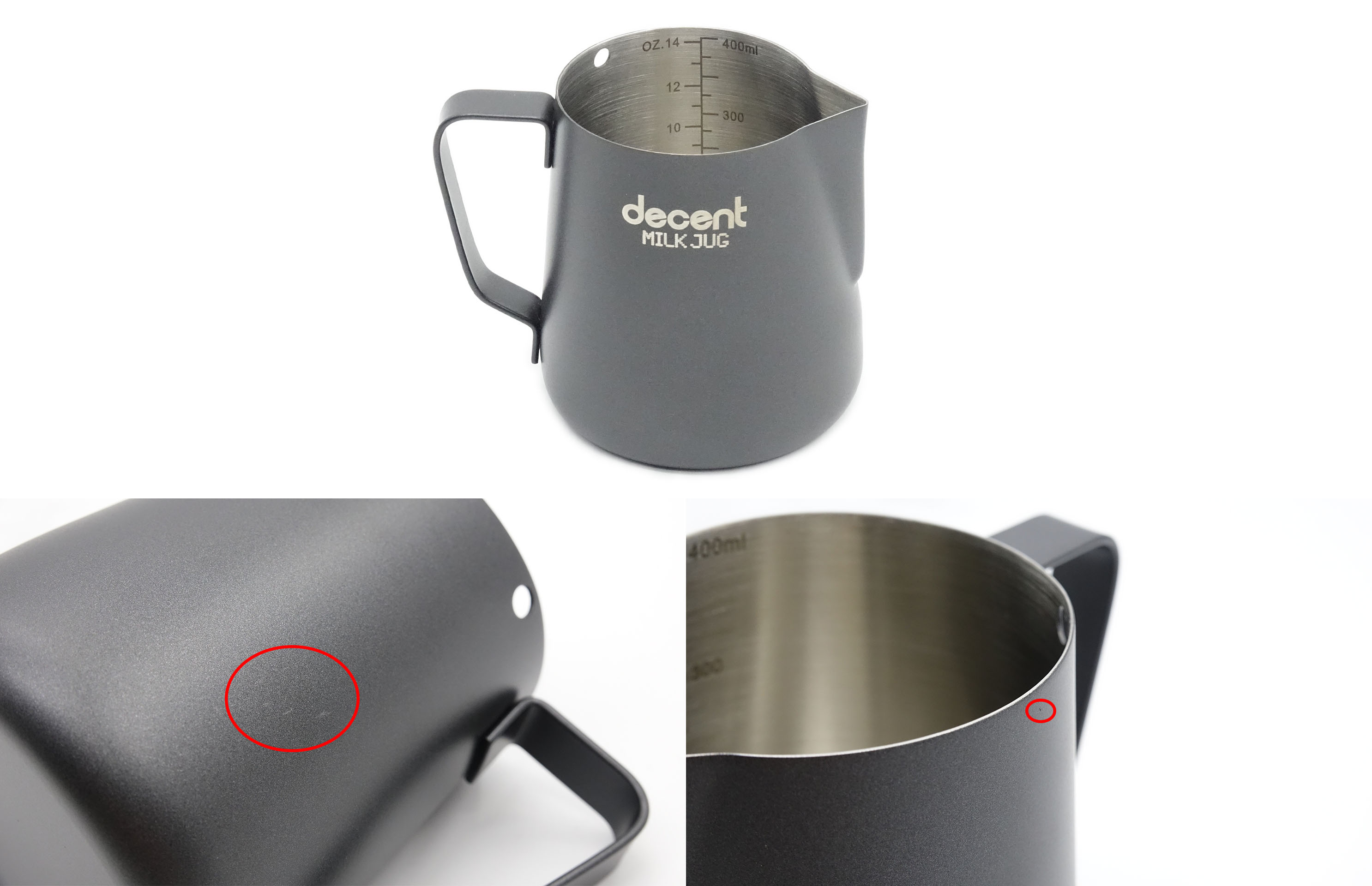 This milk jug size is the best size for single milk drinks. In addition, a common advanced latte art technique is to steam in a small milk jug, then transfer the milk to a larger jug for pouring latte art.